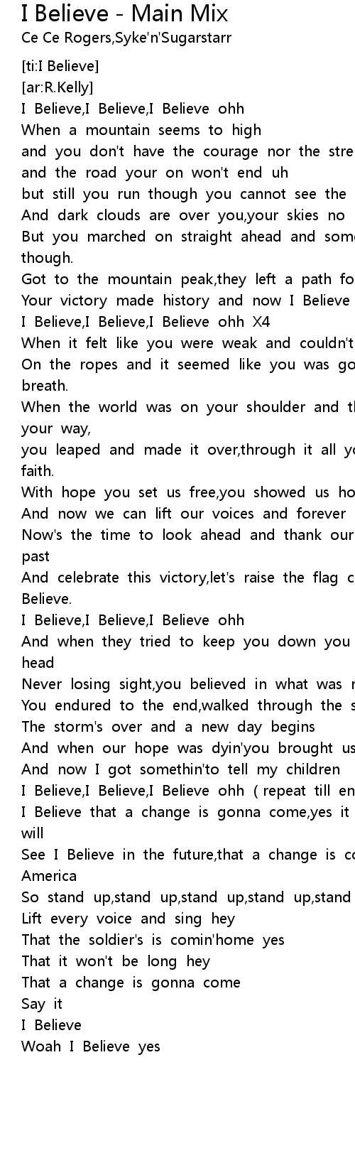 | [03:11.483] | I Believe, I Believe, I Believe ohh repeat till end |
