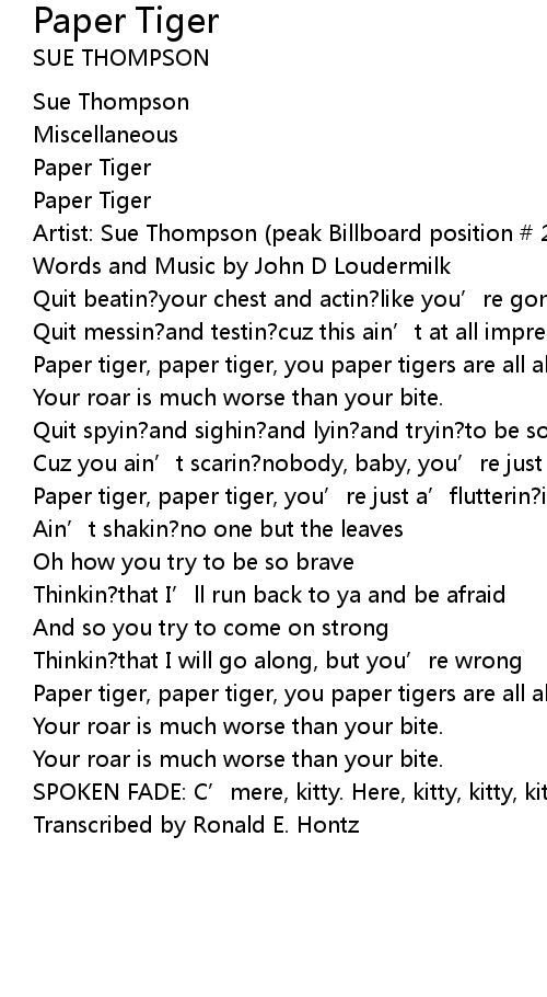 | Paper tiger, paper tiger, you' re just a' flutterin? in the tree | |