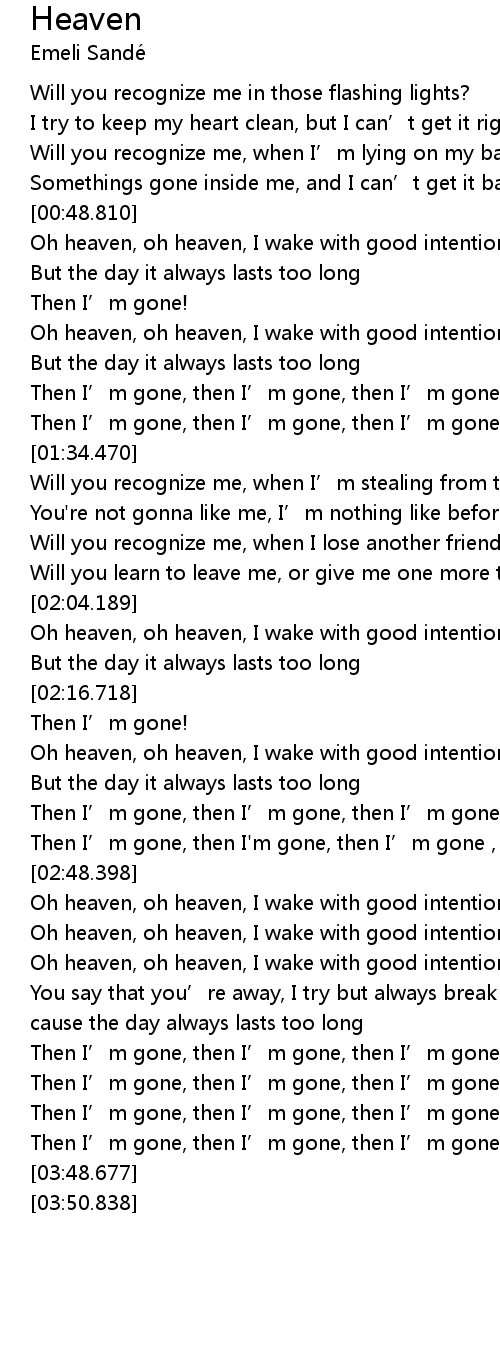 | [03:03.448] | Oh heaven, oh heaven, I wake with good intentions, |