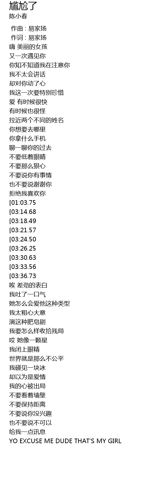 | [03:50.60][03:26.25][02:40.34][01:18.36] | 尴尬了 我糗到不行完全状况外 |