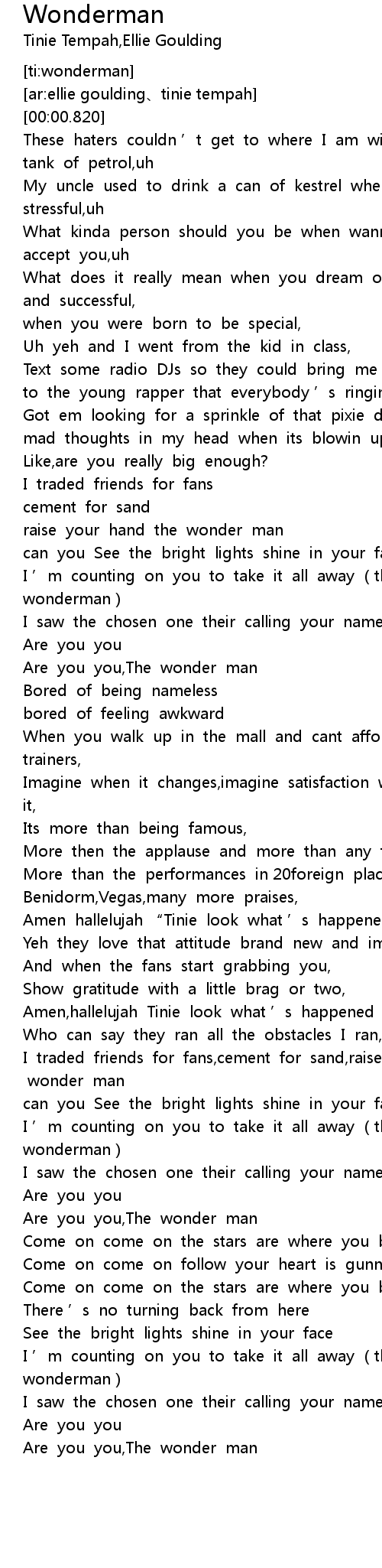 | [02:02.860] | I traded friends for fans,cement for sand,raise your hand,the wonder man |
