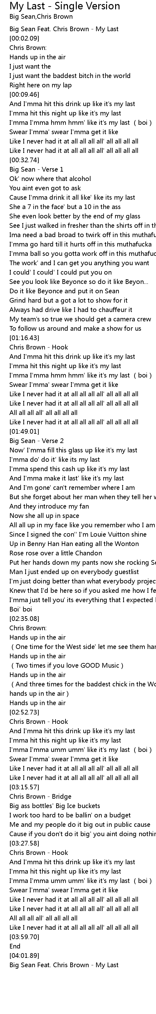 | [00:00.02] | Big Sean Feat. Chris Brown - My Last |