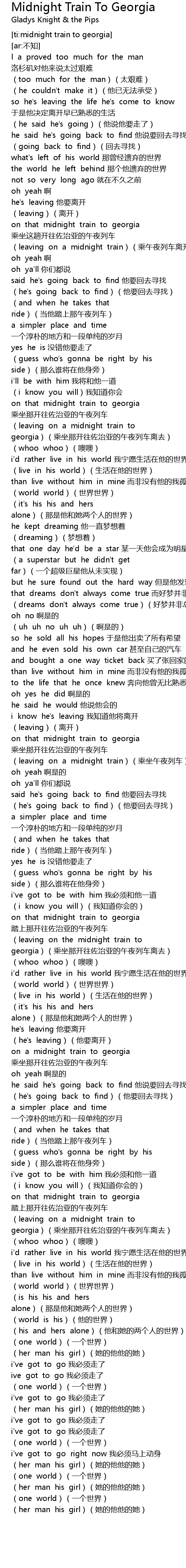 | [00:53.64] | on that midnight train to georgia chéng zuò zhè tàng kāi wǎng zuǒ zhì yà de wǔ yè liè chē |