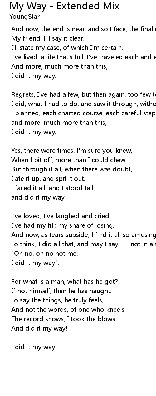 | I' ve lived, a life that' s full, I' ve traveled each and every highway. | |