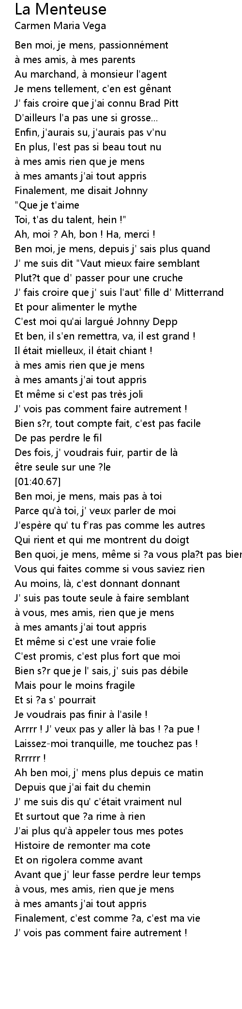 | [01:55.86] | Ben quoi, je mens, même si ?a vous pla?t pas bien |