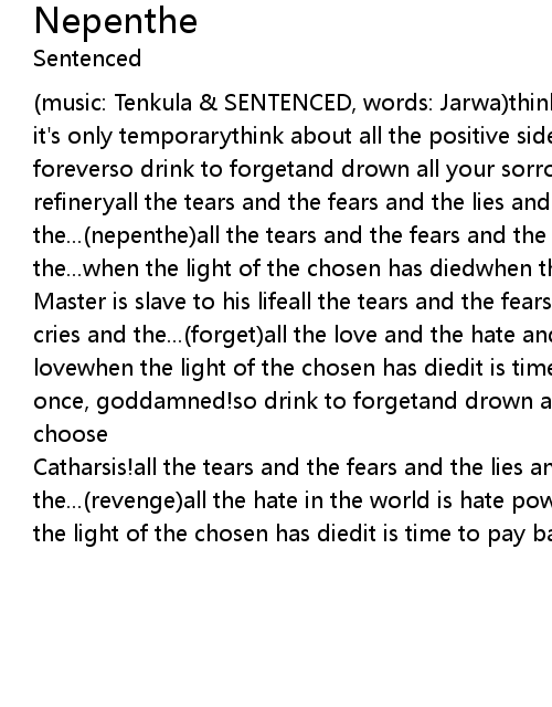 (music: Tenkula & SENTENCED, words: Jarwa)think about all the good in your life- it's only temporarythink about all the positive sides in life- they never last foreverso drink to forgetand drown all your sorrowbury your dreamschoose mind refineryall the tears and the fears and the lies and the cries and the...(nepenthe)all the tears and the fears and the lies and the cries and the...when the light of the chosen has diedwhen the