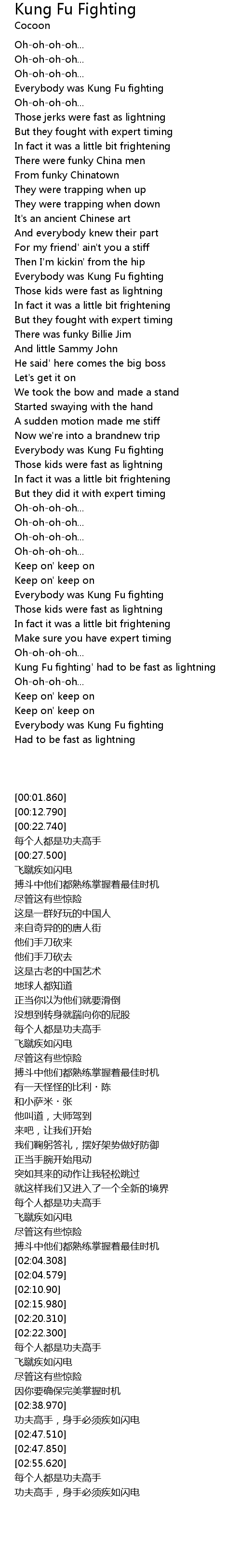 | [02:39.60] | Kung Fu fighting' had to be fast as lightning |