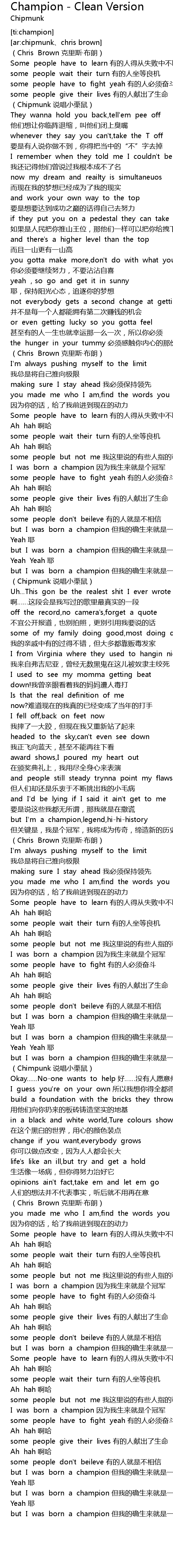 | [01:59.17] | but I'm a champion,legend,hi-hi-history 但关键是,我是个冠军,我将成为传奇,缔造新的历史 |