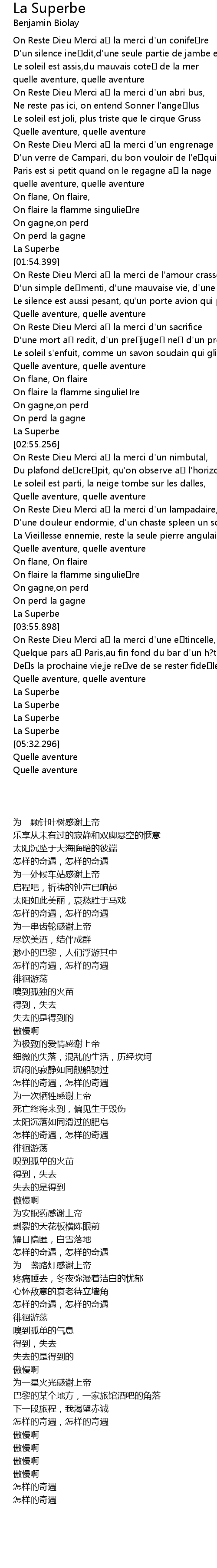 | [01:11.101] | Le soleil est joli, plus triste que le cirque Gruss |