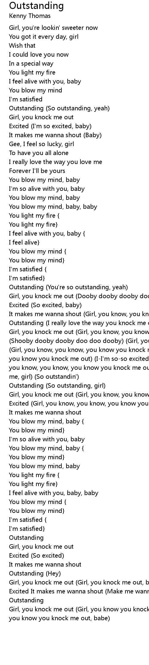 Girl, you knock me out (Girl, you know, you know, you know you knock me out) (Shooby dooby dooby doo doo dooby) (Girl, you knock me out) (So excited, baby) (Girl, you know, you know, you know you knock me out) (Girl, you know, you know, you know you knock me out) (I-I'm so-so excited) (So outstandin', baby) (Girl, you know, you know, you know you knock me out) (I really love the way you love me, girl) (So outstandin')