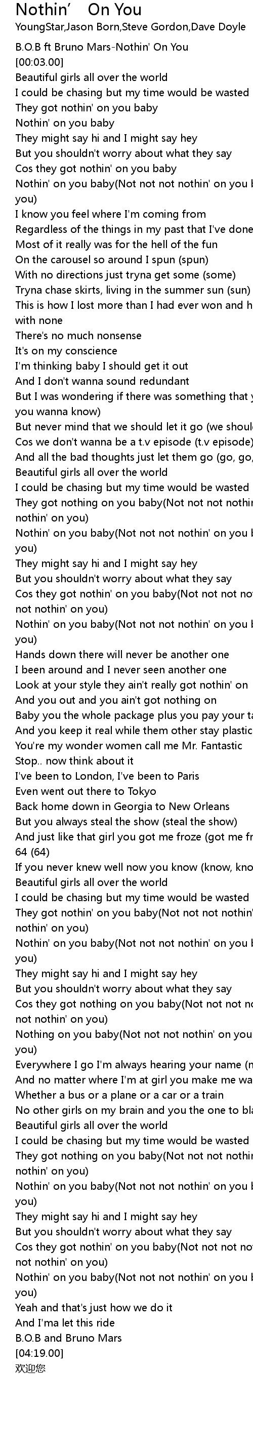 | [00:00.00] | B.O.B ft Bruno Mars-Nothin' On You |
