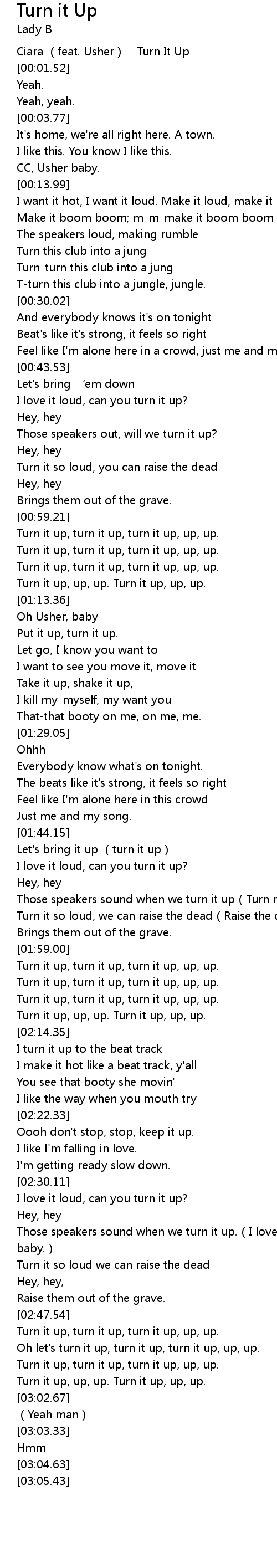 | [00:00.20] | Ciara (feat. Usher) - Turn It Up |