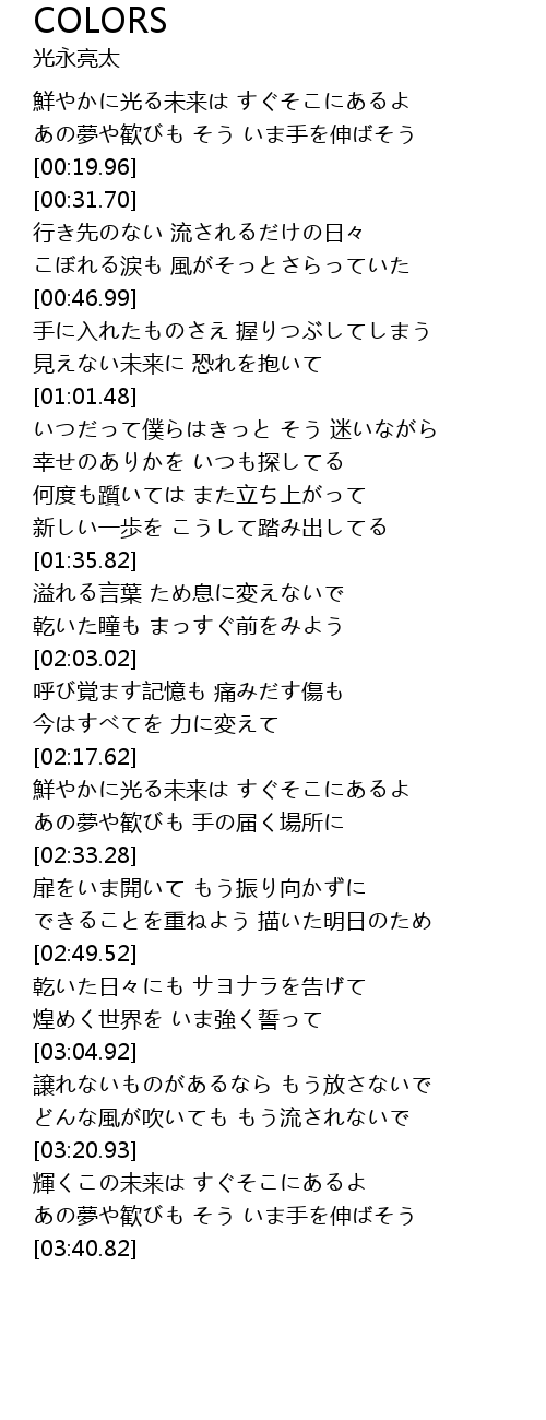 | [00:01.00] | 鮮やかに光る未来は すぐそこにあるよ |