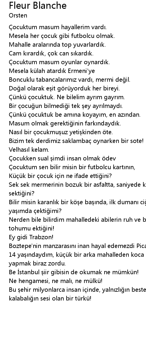 | Bilir misin karanlık bir köşe başında, ilk dumanı ciğerlerime 10 yaşımda çektiğimi? | |