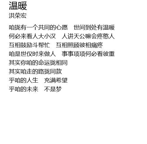 | 咱拢有一个共同的心愿 世间到处有温暖 | |