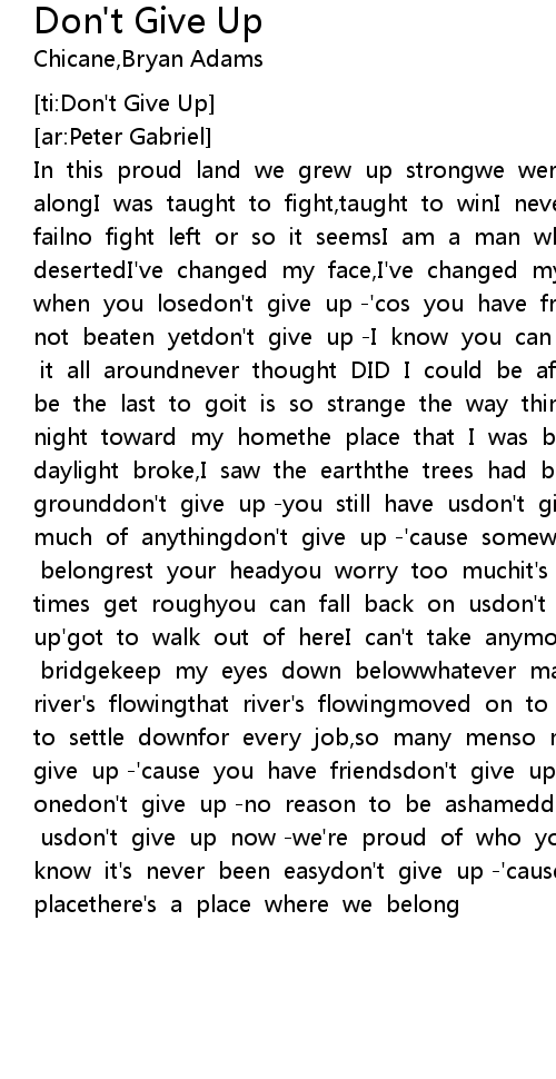 In this proud land we grew up strongwe were wanted all alongI was taught to fight,taught to winI never thought I could failno fight left or so it seemsI am a man whose dreams have all desertedI've changed my face,I've changed my namebut no one wants you when you losedon't give up -'cos you have friendsdon't give up -you're not beaten yetdon't give up -I know you can make it goodthough I saw it all aroundnever thought DID I could be affectedthought that we'd be the last to goit is so strange the way things turndrove the night toward my homethe place that I was born,on the lakesideas daylight broke,I saw the earththe trees had burned down to the grounddon't give up -you still have usdon't give up -we don't need much of anythingdon't give up -'cause somewhere there's a placewhere we belongrest your headyou worry too muchit's going to be alrightwhen times get roughyou can fall back on usdon't give upplease don't give up'got to walk out of hereI can't take anymoregoing to stand on that bridgekeep my eyes down belowwhatever may comeand whatever may gothat river's flowingthat river's flowingmoved on to another towntried hard to settle downfor every job,so many menso many men no-one needsdon't give up -'cause you have friendsdon't give up -you're not the only onedon't give up -no reason to be ashameddon't give up -you still have usdon't give up now -we're proud of who you aredon't give up -you know it's never been easydon't give up -'cause I believe there's?a placethere's a place where we belong |