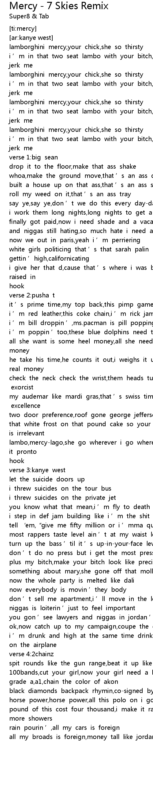 | [00:29.525] | lamborghini mercy,your chick,she so thirsty |