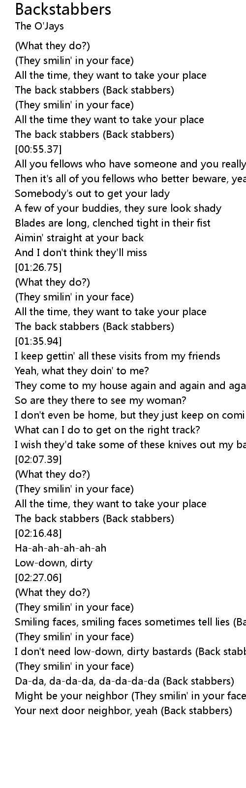 [02:33.99] Smiling faces, smiling faces sometimes tell lies (Back stabbers)