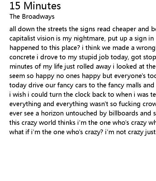 all down the streets the signs read cheaper and better technology this capitalist vision is my nightmare, put up a sign in my face what the fuck happened to this place? i think we made a wrong turn now look at hte lovely concrete i drove to my stupid job today, got stopped at an intersection 15 minutes of my life just rolled away i looked at the guy next to me he didn't seem so happy no ones happy but everyone's too busy to see let's go shopping today drive our fancy cars to the fancy malls and for lunch we'll have big macs i wish i could turn the clock back to when i was ten when i wasn't scared of everything and everything wasn't so fucking crowded and i wonder if my kids will ever see a horizon untouched by billboards and shopping malls and i wonder if this crazy world thinks i'm the one who's crazy what if i'm the one who's crazy? what if i'm the one who's crazy? i'm not crazy just frustrated |