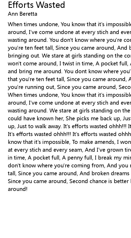 When times undone, You know that it's impossible, To make amends, I won't come around, I've come undone at every stich and every seam, And I've grown tired of wasting around. You don't know where you're coming from, And you must think that you're ten feet tall, Since you came around, And broken dreams are what you're bringing out. We stare at girls standing on the corner, But chances are you won't come around, I twist in time, A pocket full, A penny full, I break my mind and bring me around. You dont know where you're coming from, And you must think that you're ten feet tall, Since you came around, And broken dreams are what you're running out, Since you came around, Second chance is better left without. When times undone, You know that it's impossible, To make amends, I won't come around, I've come undone at every stich and every seam, And I've grown tired of wasting around. We stare at girls standing on the corner, But chances are that I could have known her, She picks me back up, Just to walk away, She picks me back up, Just to walk away. It's efforts wasted ohhh!!! It's efforts wasted ohhh!!! It's efforts wasted ohhh!!! It's efforts wasted ohhh!!! When times undone, You know that it's impossible, To make amends, I won't come around, I've come undone at every stich and every seam, And I've grown tired of wasting around. I twist in time, A pocket full, A penny full, I break my mind, And bring me around. You don't know where you're coming from, And you must think that you're ten feet tall, Since you came around, And broken dreams are what you're running out, Since you came around, Second chance is better left without, Since you came around! |
