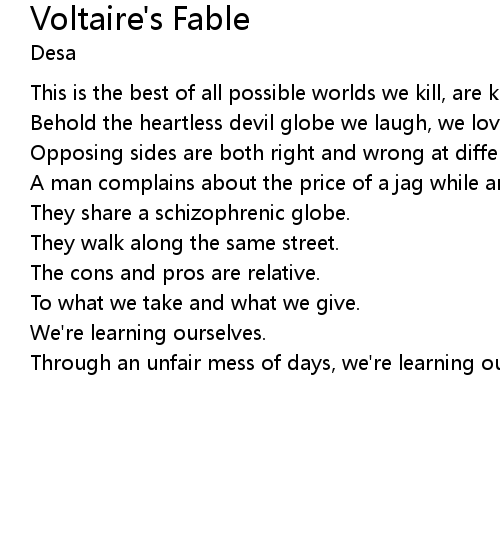 | This is the best of all possible worlds we kill, are killed, and cry in. | |
