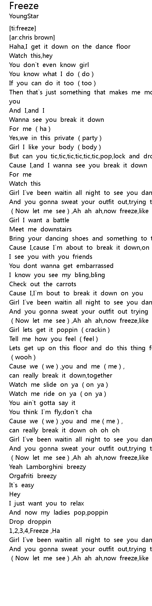 | [02:47.42] | Now let me see, Ah ah ah, now freeze, like me, oooh |