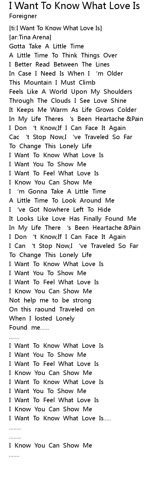 | [03:23.72] | I Want To Know What Love Is |