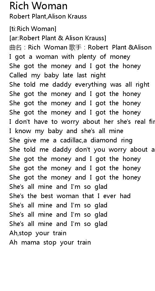 | [00:03.930] | qu ming: Rich Woman ge shou: Robert Plant Alison Krauss |