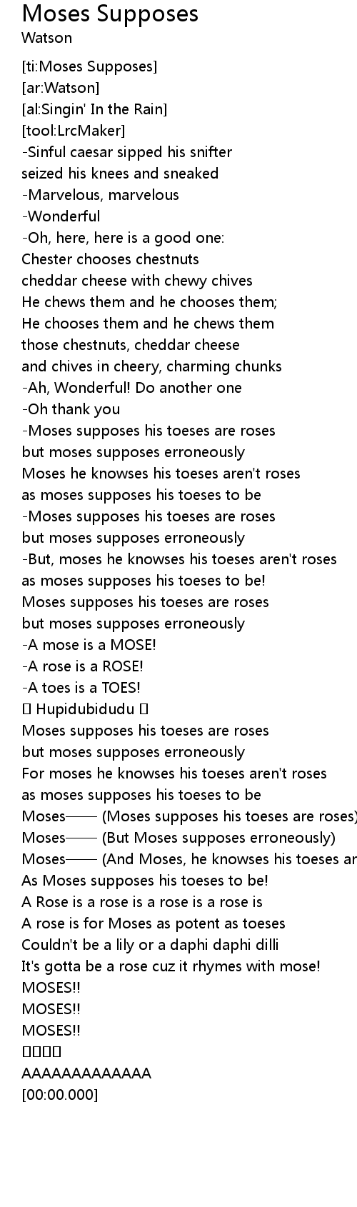 | [01:11.926] | Moses—— (Moses supposes his toeses are roses) |