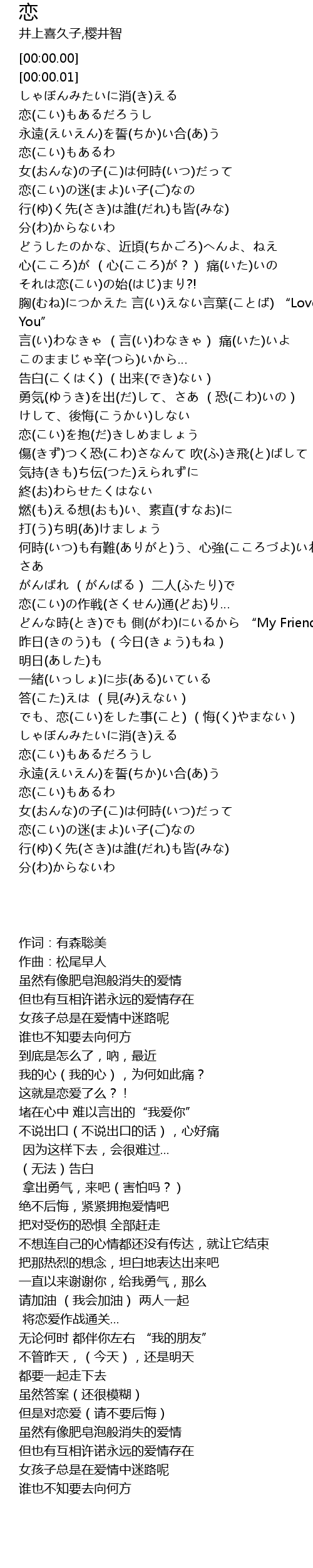 | [00:00.02] | しゃぼんみたいに消(き)える 恋(こい)もあるだろうし |