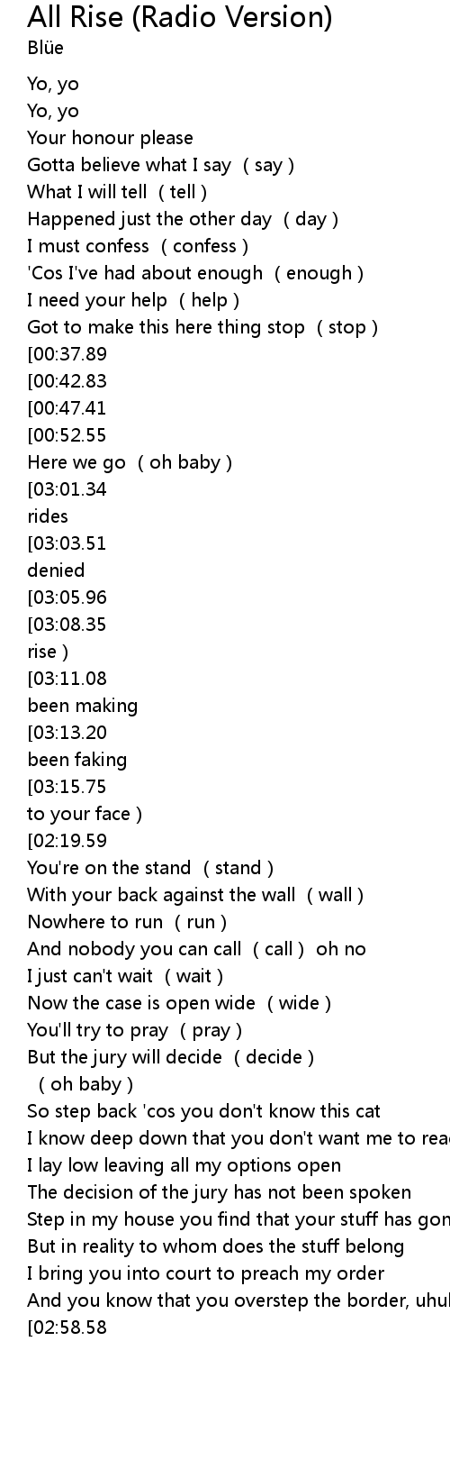 | [03:37.88][02:19.59][01:16.06] | All rise (I rest my case) |