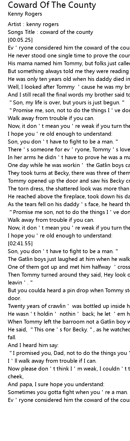 | [00:02.25] | Songs Title: coward of the county |