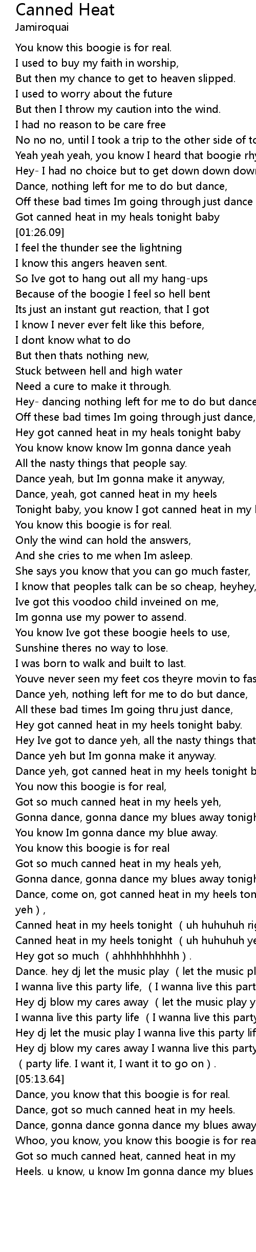 | [03:21.37] | Hey got canned heat in my heels tonight baby. |