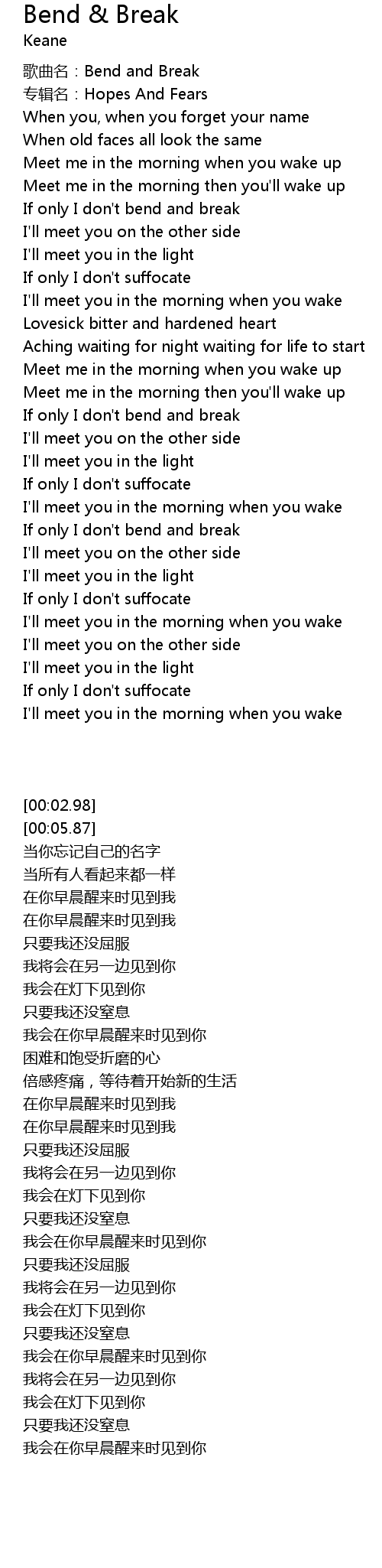 | [00:02.98] | 歌曲名:Bend and Break |