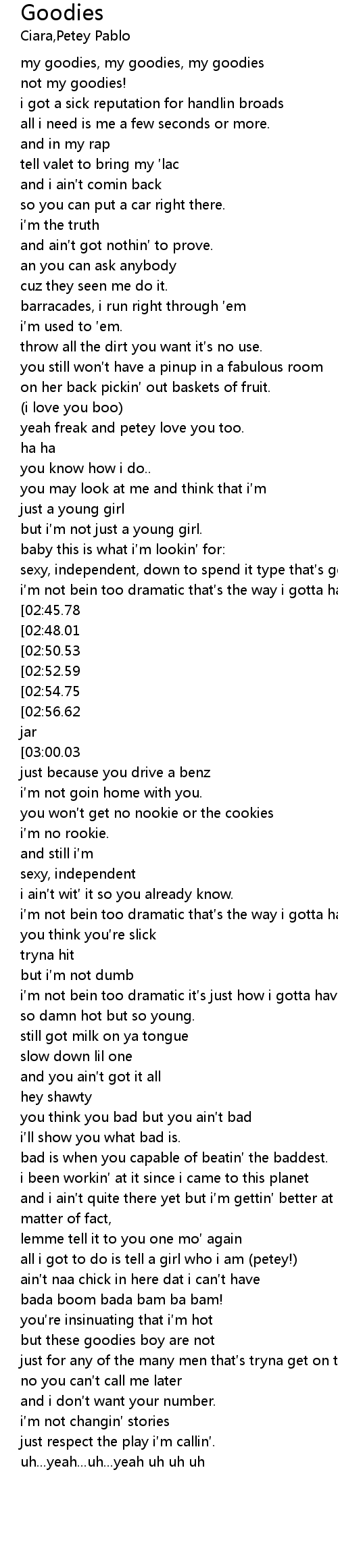 | [00:00.70] | my goodies, my goodies, my goodies |