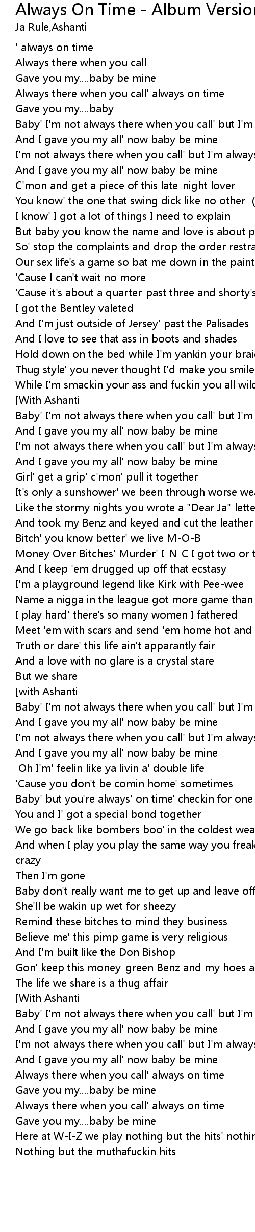 | [00:19.99] | Baby' I'm not always there when you call' but I'm always on time |