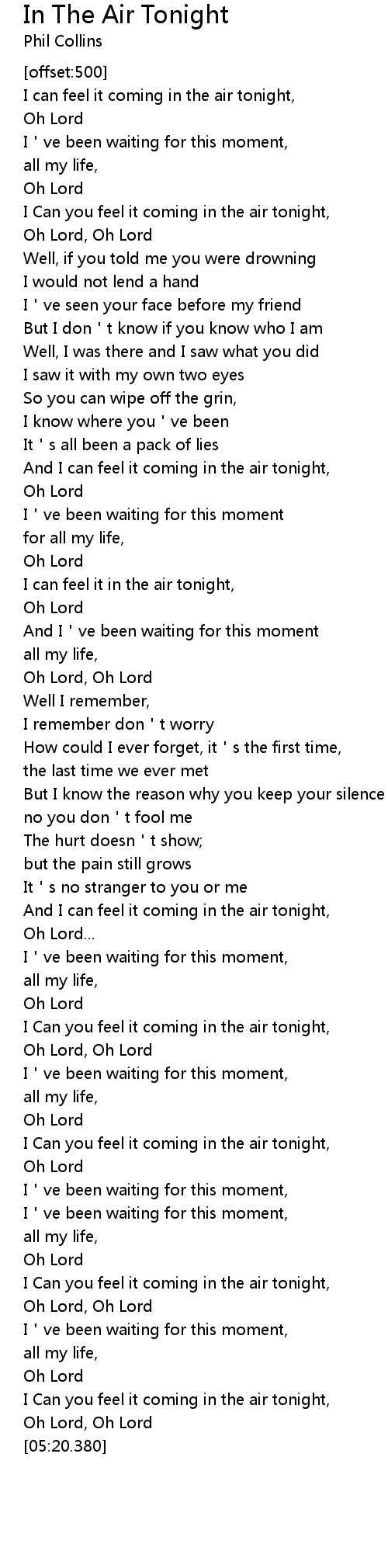 | [04:03.810] | I Can you feel it coming in the air tonight, |