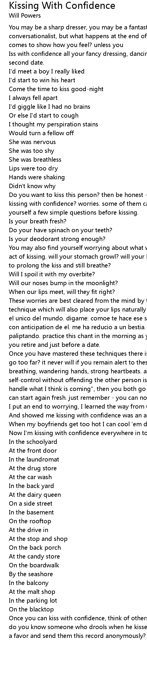 Once you can kiss with confidence, think of others these techniques will help. do you know someone who drools when he kisses or burps or bites? why not do them a favor and send them this record anonymously? |