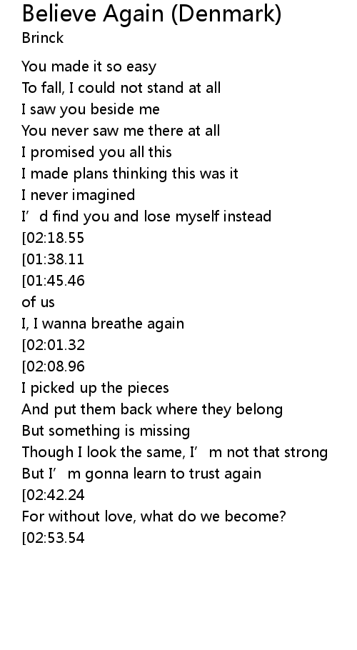 | [01:10.98][02:08.96][02:57.69] | I wanna believe again |