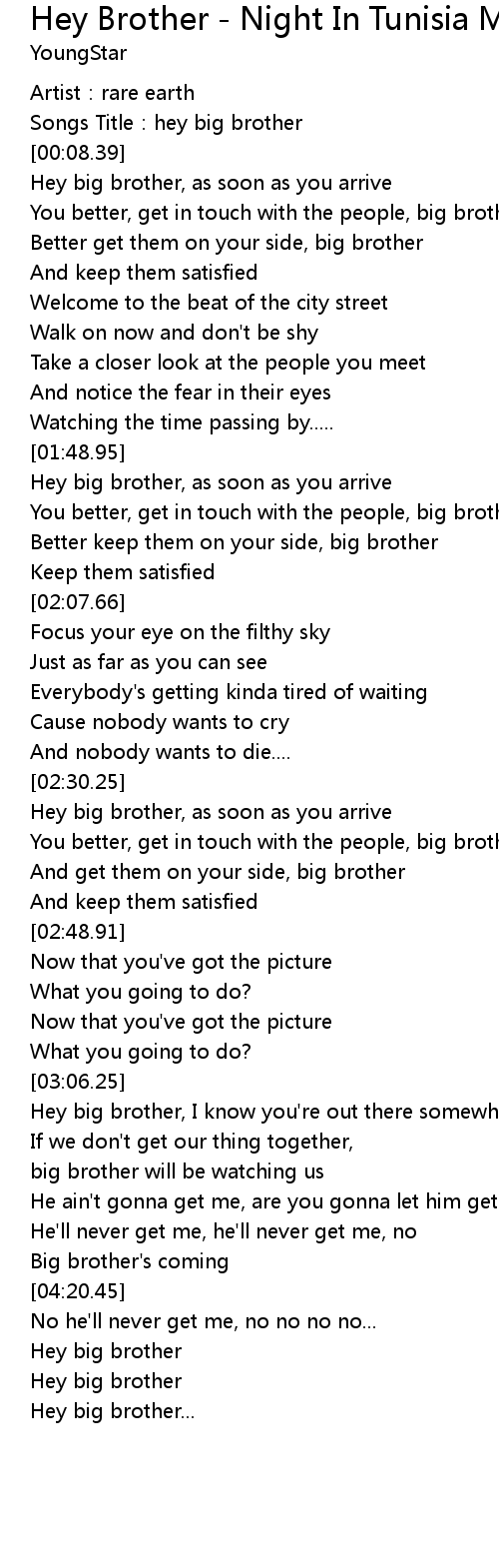 | [03:48.64] | Hey big brother, I know you' re out there somewhere |