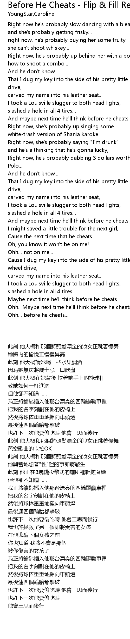 | [01:12.790] | white-trash version of Shania karoke.. |