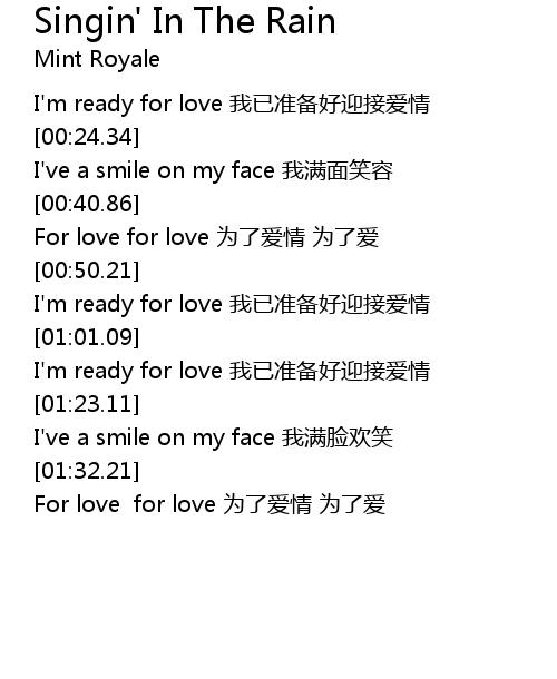 | [01:20.67] | I' m ready for love wǒ yǐ zhǔn bèi hǎo yíng jiē ài qíng |