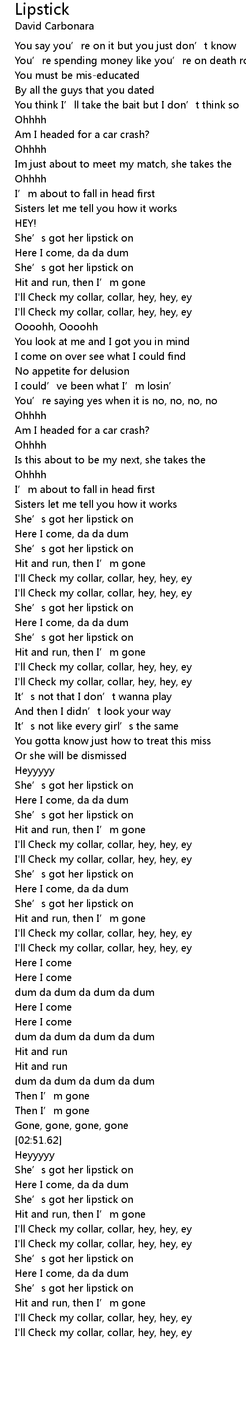 | [03:15.49] | I'll Check my collar, collar, hey, hey, ey |