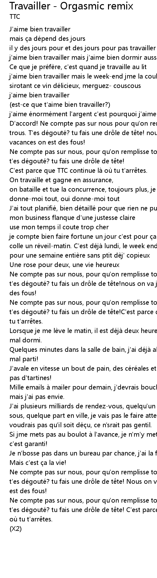 | Ne compte pas sur nous, pour qu' on remplisse ton emploi du temps et ses trous! t' es dé gouté? tu fais un dr le de t te! nous on va jamais en vacances on est des fous! | |
