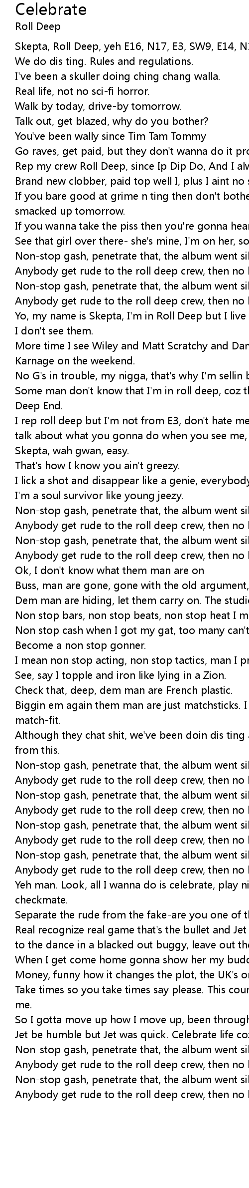 | Yo, my name is Skepta, I'm in Roll Deep but I live in North London so sometimes I don't see them. | |