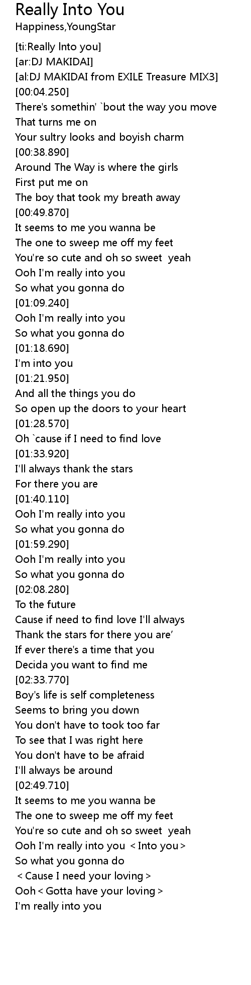 | [03:00.260] | Ooh I'm really into you <Into you> |