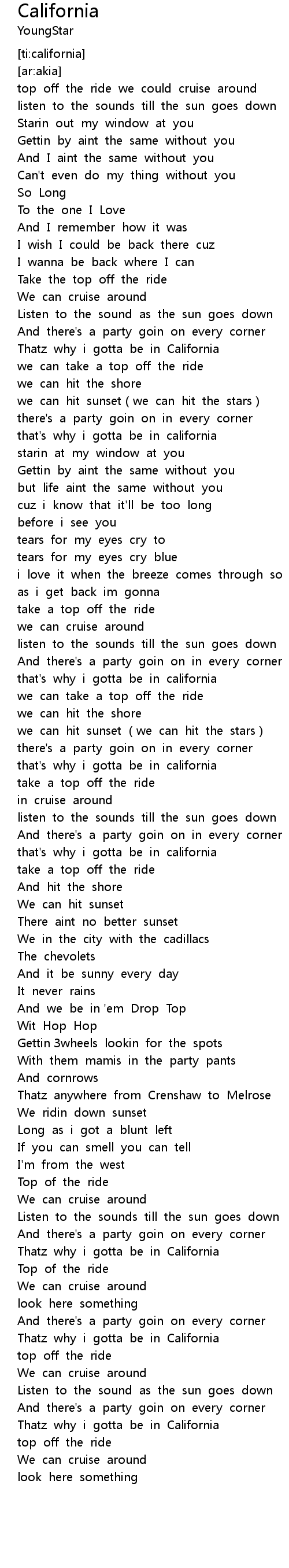 | [00:59.869] | that' s why i gotta be in california |