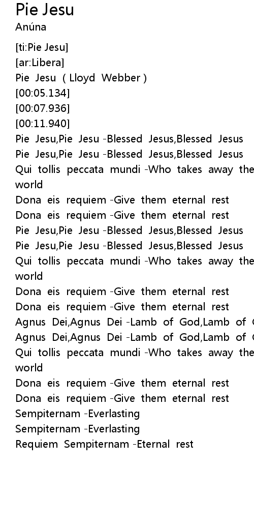 | [00:29.749] | Pie Jesu, Pie Jesu Blessed Jesus, Blessed Jesus |