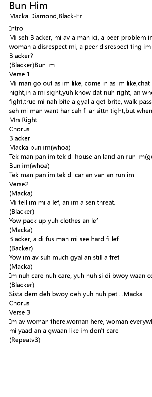 Mi man go out as im like, come in as im like,chat pan phone will gal whole night,in a mi sight,yuh know dat nuh right, an when mi a talk a me im waan fight,true mi nah bite a gyal a get brite, walk pass mi trow wud a get hype,she seh mi man want har cah fi ar sittn tight,but when in come home im seh a me a Mrs.Right |