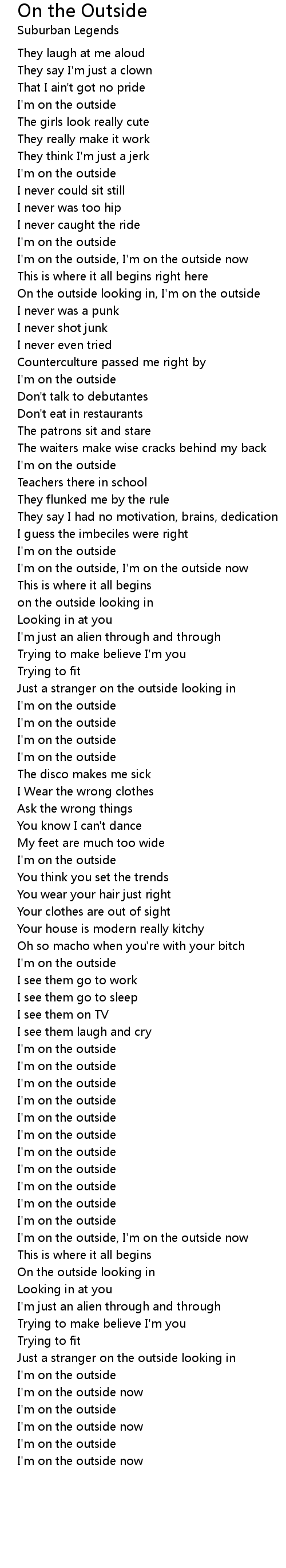 I'm on the outside, I'm on the outside now |